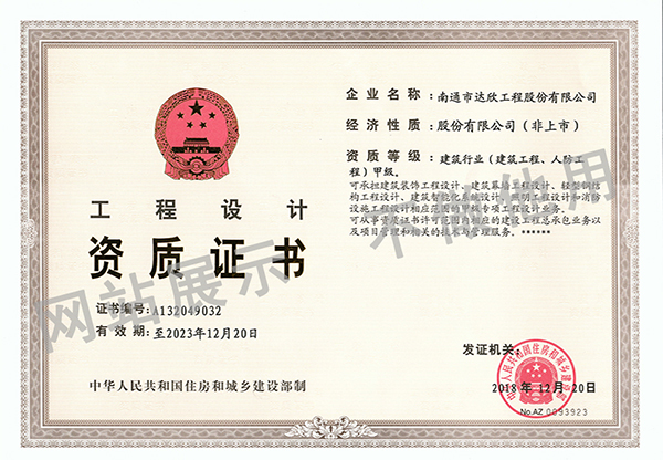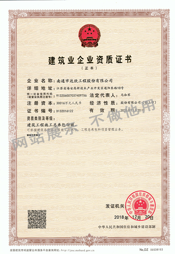 2018年12月26日,中國(guó)住房和城鄉(xiāng)建設(shè)部官網(wǎng)發(fā)布《關(guān)于核準(zhǔn)2018年度第十批建筑工程企業(yè)資質(zhì)名單的公告》(中華人民共和國(guó)住房和城鄉(xiāng)建設(shè)部公告2018年第328號(hào)),批準(zhǔn)南通市達(dá)欣工程股份有限公司成功晉升建筑工程施工總承包特級(jí)資質(zhì),同時(shí)獲得建筑行業(yè)(建筑工程、人防工程)甲級(jí)設(shè)計(jì)資質(zhì)。