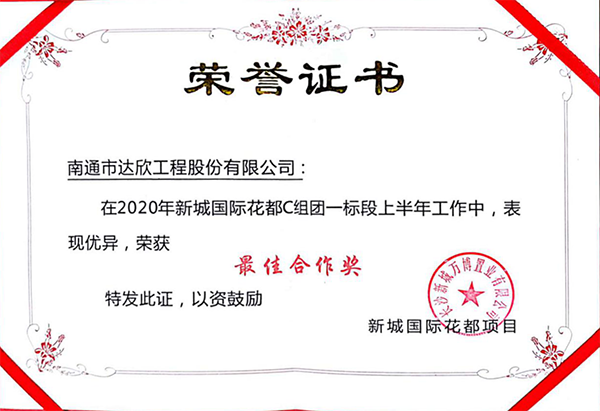 近日,新城國際花都C組團一、二標段項目,在公司各級領(lǐng)導的關(guān)心支持下,在項目全體施工人員的共同努力下,提前實現(xiàn)交付。為此,獲得長沙新城萬博置業(yè)有限公司工程授予的《奮勇拼搏》、《最佳合作》兩個獎項,博得了新城萬博置業(yè)有限公司對我司工作的高度認可。