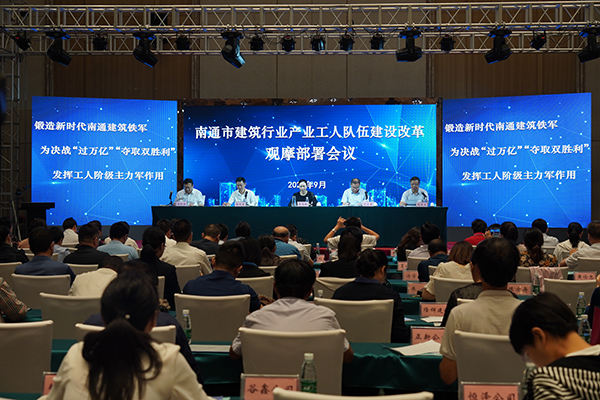 9月17日上午,南通市建筑行業(yè)產(chǎn)業(yè)工人隊伍建設(shè)改革觀摩部署會在達(dá)欣集團(tuán)舉行。南通市總工會黨組書記、副主席、產(chǎn)業(yè)工人隊伍建設(shè)改革聯(lián)席會議辦公室主任葛志娟,南通市住房和城鄉(xiāng)建設(shè)局黨組副書記、副局長、一級調(diào)研員沈衛(wèi)星,南通市總工會四級調(diào)研員楊紅衛(wèi);各(縣)市、區(qū)總工會領(lǐng)導(dǎo)、勞動和經(jīng)濟(jì)工作部部長,以及南通市建筑施工特級資質(zhì)企業(yè)、海安市建筑施工一級資質(zhì)企業(yè)負(fù)責(zé)產(chǎn)改的主要領(lǐng)導(dǎo)等120多人參加觀摩會。海安市委常委、組織部部長、統(tǒng)戰(zhàn)部部長張明星,海安市政協(xié)副主席、總工會主席李如生;海安市總工會黨組書記、副主席柴寶清,海安市建管局局長賈伯根等陪同參加;集團(tuán)董事長馬和軍,黨委書記劉厚純,副總經(jīng)理、工會主席溫鶴華參加活動。