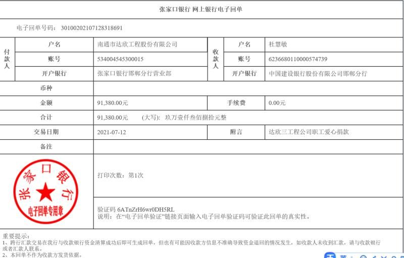 同事們在得知情況后,紛紛伸出援手,獻出一份愛和情誼,在大家的共同努力下,共籌到善款91380元,并于第一時間匯到杜慧敏賬戶里。希望她能盡快走出病痛的折磨,早日康復!