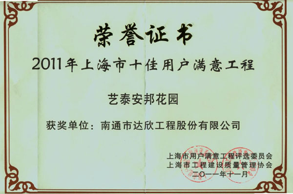 上海市“十佳用戶滿意工程”是上海市建筑業(yè)重量級(jí)獎(jiǎng)項(xiàng),是上海市在建的大型工程中,通過業(yè)主等部門使用后,選出十五項(xiàng)質(zhì)量?jī)?yōu)秀、后期運(yùn)行穩(wěn)定、服務(wù)質(zhì)量?jī)?yōu)秀的工程為候選單位,并在十五項(xiàng)候選工程中選出十項(xiàng)通過專家評(píng)審,方可獲得上海市“十佳用戶滿意工程”獎(jiǎng)。獲此獎(jiǎng)項(xiàng)標(biāo)志著達(dá)欣公司進(jìn)滬施工的信譽(yù)和業(yè)績(jī)提高到了一個(gè)更高層次,必將對(duì)持續(xù)經(jīng)營(yíng)開發(fā)起到良好的社會(huì)影響。