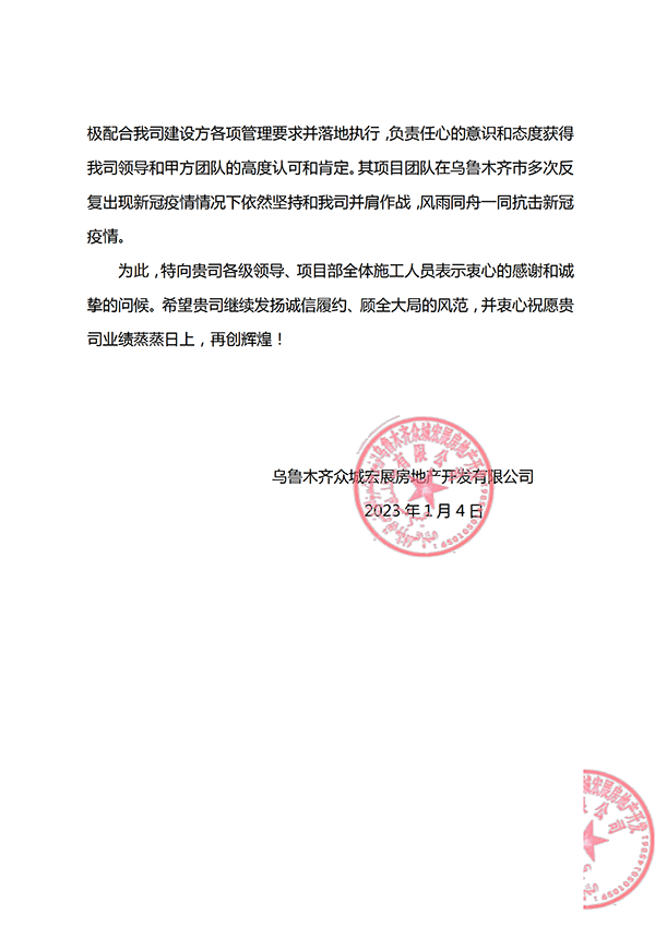 1月10日,集團(tuán)公司收到來(lái)自烏魯木齊眾城宏展房地產(chǎn)開(kāi)發(fā)有限公司的一封表?yè)P(yáng)信,信中對(duì)集團(tuán)第十一公司烏魯木齊碧桂園·黃金時(shí)代二期工程項(xiàng)目部,自2022年8月10日烏魯木齊市實(shí)施新冠疫情防控以來(lái),項(xiàng)目部全體人員在疫情防控和項(xiàng)目建設(shè)中表現(xiàn)出的責(zé)任與擔(dān)當(dāng)表示感謝。內(nèi)容詳見(jiàn)附件: