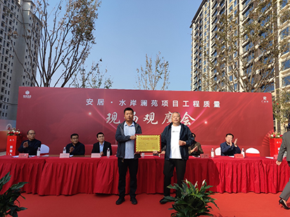 10月19日,第三工程公司承建的安居?水岸瀾苑項目工程質(zhì)量現(xiàn)場觀摩會暨廣平縣2023年度建設(shè)質(zhì)量樣板工程頒獎儀式隆重舉行。邯鄲市建筑工程質(zhì)量管理站副站長徐金峰、張少軍科長、廣平縣建筑工程質(zhì)量監(jiān)督站,廣平縣在建工程各施工單、監(jiān)理單位、地產(chǎn)開發(fā)商代表等120余人參加活動。安居?水岸瀾苑項目經(jīng)理吉光代表公司接受“2023年度建設(shè)質(zhì)量樣板工程”獎牌。