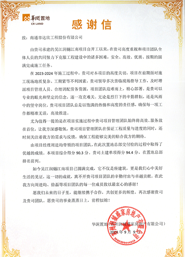 近日,公司收到華潤置地發(fā)來的感謝信,信中對集團第一工程公司承建的吳江潤樾江南項目在施工過程中攻堅克難,嚴把安全生產(chǎn)關(guān),促進項目履約,為華潤置地高質(zhì)量發(fā)展作出的貢獻表示感謝。
