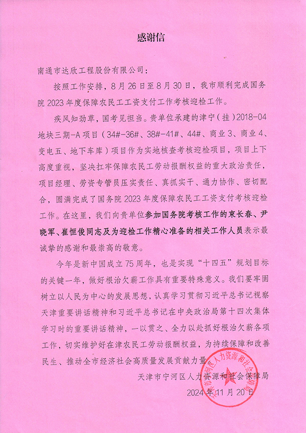 近日,第六工程公司承建的津?qū)帲⊕欤?018-04地塊項(xiàng)目三期工程代表天津市參加2023年度國(guó)家級(jí)省際交叉核查,在國(guó)務(wù)院針對(duì)省級(jí)根治欠薪工作整體情況的檢查中成績(jī)優(yōu)異,榮獲“標(biāo)桿項(xiàng)目”榮譽(yù)稱號(hào),并對(duì)迎檢過程中全體工作人員真抓實(shí)干、通力協(xié)作的精神表示感謝。