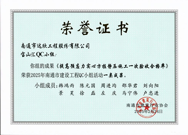 2月24日,南通市建筑行業(yè)協(xié)會發(fā)布2025年南通市工程建設(shè)質(zhì)量管理小組(QC 小組)活動評價結(jié)果,公司寶山區(qū)大場鎮(zhèn) W12-1301 單元 32-04 地塊項目寶山匯 QC 小組選送的《提高預(yù)應(yīng)力實心方樁靜壓施工一次驗收合格率》成果,榮獲一類成果。