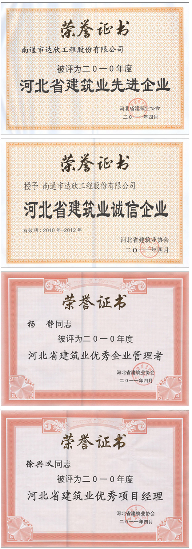 第四工程公司憑著多年的誠信經(jīng)營與良好的企業(yè)聲譽(yù),在本次會議上榮獲多項(xiàng)殊榮:“2010年度河北省建筑業(yè)先進(jìn)企業(yè)”、“2010-2012年度河北省建筑業(yè)誠信企業(yè)”,楊靜同志榮獲“2010年度河北省建筑企業(yè)優(yōu)秀管理者”,徐興義同志榮獲“2010年度河北省建筑企業(yè)優(yōu)秀項(xiàng)目經(jīng)理”。
