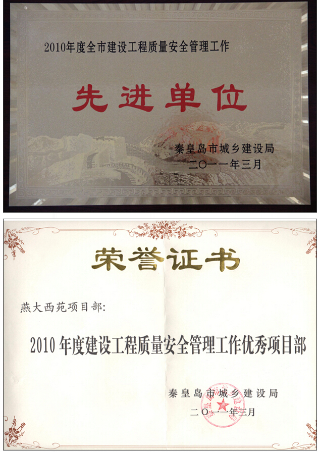 2011年3月8日,秦皇島市城鄉(xiāng)建設(shè)局召開2010年度全市建設(shè)工程質(zhì)量安全管理工作先進(jìn)單位和先進(jìn)個(gè)人表彰大會(huì):第三工程公司獲2010年度秦皇島市建設(shè)工程質(zhì)量安全管理工作先進(jìn)單位;燕大西苑三標(biāo)段項(xiàng)目部獲優(yōu)秀項(xiàng)目部;燕大西苑三標(biāo)段項(xiàng)目經(jīng)理?xiàng)疃Y虎獲優(yōu)秀項(xiàng)目經(jīng)理。