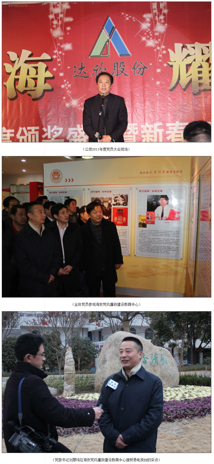 會(huì)議由公司董事長(zhǎng)、黨委副書記馬和軍同志主持,上午在進(jìn)行了4名預(yù)備黨員同志入黨誓詞、各支部推薦的7名優(yōu)秀黨員后,盧榮翔書記對(duì)公司全體黨員進(jìn)行了冬訓(xùn)補(bǔ)課講座,他從家鄉(xiāng)的建設(shè)發(fā)展、建筑業(yè)面臨的發(fā)展機(jī)遇等進(jìn)行了講述,并對(duì)公司的未來(lái)發(fā)展方向提出了要求與希望,勉勵(lì)全體黨員要在科學(xué)觀的引領(lǐng)下,積極開展創(chuàng)先爭(zhēng)優(yōu)活動(dòng),為達(dá)欣的強(qiáng)勁發(fā)展做出應(yīng)有的貢獻(xiàn)。接著公司黨委書記劉厚純同志作了題為“揚(yáng)帆起航聚心力,創(chuàng)先爭(zhēng)優(yōu)求發(fā)展”2010年黨建總結(jié)暨2011年黨建工作要求的報(bào)告,報(bào)告從突出黨組織建設(shè),發(fā)揮堅(jiān)強(qiáng)的堡壘作用、突出生產(chǎn)經(jīng)營(yíng)建設(shè),為企業(yè)發(fā)展助力升威、突出改革創(chuàng)新理念,發(fā)揮黨員引領(lǐng)作用、突出“創(chuàng)先爭(zhēng)優(yōu)”活動(dòng)主題,營(yíng)造積極向上的企業(yè)氛圍等六個(gè)方面對(duì)2010年進(jìn)行了總結(jié),對(duì)2011年的黨建工作目標(biāo)、工作重點(diǎn)、工作舉措進(jìn)行了闡述,要求全體黨員同志要進(jìn)一步增強(qiáng)政治意識(shí)、責(zé)任意識(shí)、創(chuàng)新創(chuàng)優(yōu)意識(shí)、大局意識(shí),為公司全面完成2011年各項(xiàng)工作任務(wù)而共同努力!