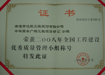 2008年7月6日,由中國建筑業(yè)協(xié)會組織的2008年度全國工程建設(shè)優(yōu)秀質(zhì)量管理(QC)小組活動成果發(fā)布會在廣西桂林落下帷幕,我公司中華商務(wù)廣場工程項目部QC小組作為河北省推薦的十二個省級QC小組之一參加了會議并榮獲全國工程建設(shè)優(yōu)秀QC小組。這是我公司以“達欣”品牌獲得的第一項國家級 QC成果獎。