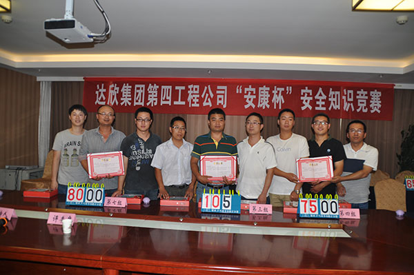 各項目部在建筑物上懸掛安全生產(chǎn)宣傳標(biāo)語24條幅;組織廣大職工觀看建筑施工中的事故案例,結(jié)合施工過程中的實際情況進(jìn)行分析點評;對全體職工進(jìn)行了血壓檢測;舉行了“安全生產(chǎn)月”主題簽名活動。工程公司于6月8、9日在留村項目部組織所有在崗管理人員進(jìn)行了安全知識培訓(xùn)。6月22日工程公司舉行了“安康杯”安全知識競賽,24名選手分8組參賽。經(jīng)過必答題、搶答題、附加題3個環(huán)節(jié)的比拼,最終眾美綠都項目部以領(lǐng)先笫二名25分的優(yōu)勢獲得冠軍,拉斐小鎮(zhèn)、留村莊園A區(qū)分獲二、三名。通過以上活動的開展,進(jìn)一步提高了廣大職工的安全生產(chǎn)知識和安全意識,確保安全生產(chǎn)。